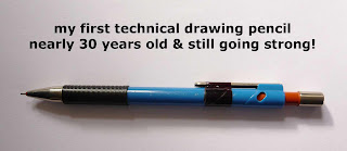 My first 'proper' pencil still sits on my desk. It is my first technical drawing pencil which I got after college, I suppose that was when I warranted a bit better piece of kit than a 5p HB from the newsagents! I'm guessing it's getting on for 25 - 30 yrs old and it's still a lovely, comfortable old thing to use.